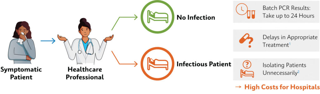 2 Hinson J, et al. Targeted rapid testing for SARS-CoV-2 in the emergency department is associated with large reductions in uninfected patient exposure time. The Journal of Hospital Infection. 2020 Oct;107:35-39.